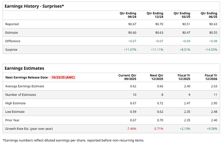 The energy behemoth is expected to announce its fiscal Q3 earnings for 2025 after the market closes on Thursday, Oct. 23. Ahead of this event, analysts expect this energy technology company to report a profit of $0.62 per share, down 7.5% from $0.67 per share in the year-ago quarter. The company has a solid trajectory of consistently beating Wall Street’s earnings estimates in each of the last four quarters.
