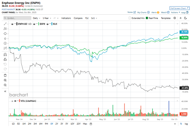 ENPH stock has declined 65.4% over the past 52 weeks, substantially underperforming the Technology Select Sector SPDR Fund’s (XLK) 27.5% surge and the S&P 500 Index’s ($SPX) 17.4% uptick during the same time frame.