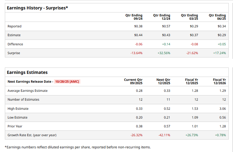 The company is expected to announce its fiscal Q3 earnings results on Tuesday, Oct. 28. Ahead of this event, analysts expect the energy company to report a profit of $0.28 per share, down 26.3% from $0.38 per share in the year-ago quarter. The company has surpassed Wall Street's bottom-line estimates in two of the past four quarters, while missing on two other occasions.