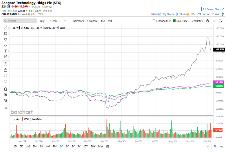 Shares of Seagate Technology have climbed 106.5% over the past 52 weeks, considerably outperforming the broader S&P 500 Index's ($SPX) 17.4% rise and the Technology Select Sector SPDR Fund's (XLK) 27.5% gain over the same period.